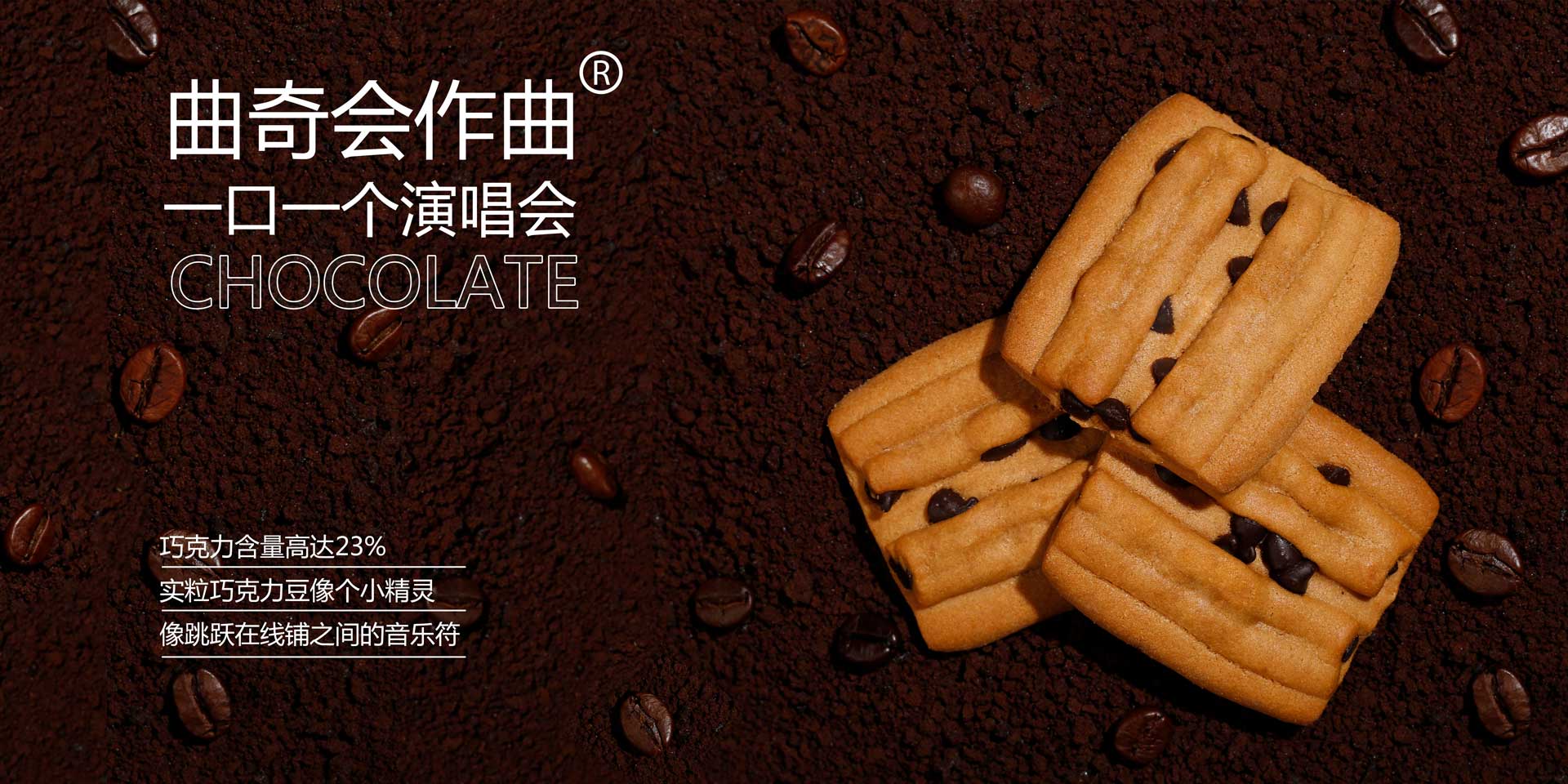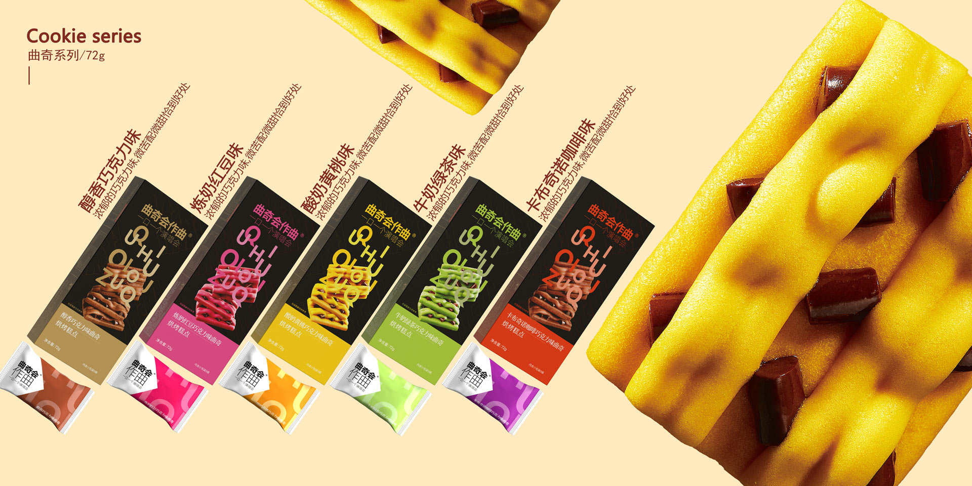 創(chuàng)新曲奇餅體拉絲技術,添加優(yōu)質香醇的進口巧克力豆,像跳躍在線譜之間的音樂符,以“樂譜”形象打造香美客的獨特品類:音樂曲奇···