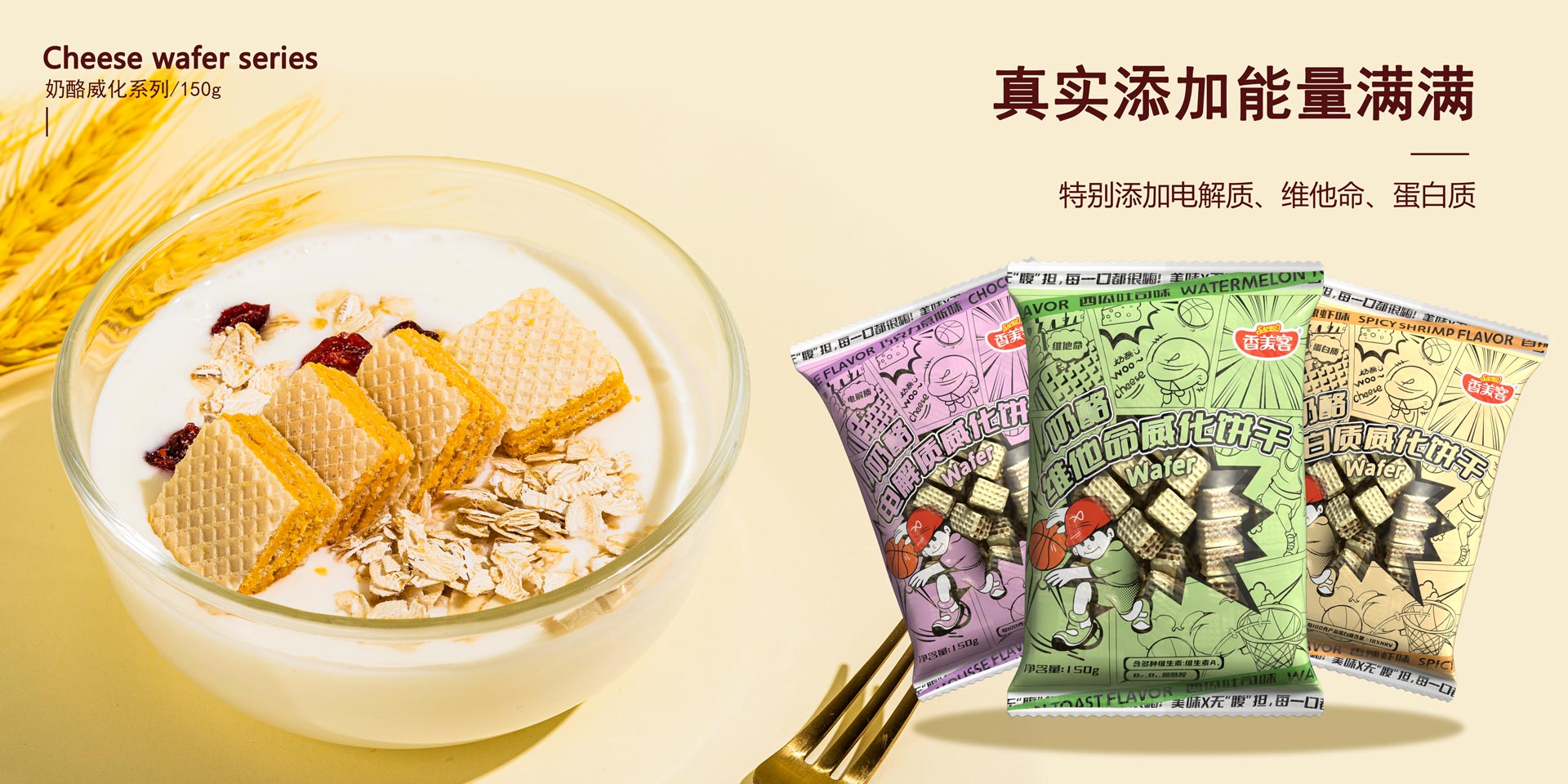 香美客暴腹威化層層酥脆,入口即化,不甜膩,用料好,特別添加了蛋白質、電解質、維生素,真材實料,0反式脂肪酸。
